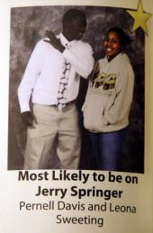 Another photo, of the winners of the "Most Likely To Be On Jerry Springer" category, features a male student pretending to be on the verge of hitting a female with the back of his hand.