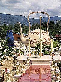 The giant teapot and other key structures at the Sky Kingdom commune came tumbling down yesterday after the Besut District Council sent in it's demolition squad.