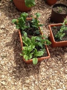 The container garden is shaping up. I took this pic yesterday. * * * * * * * Key element of container gardening: Herbs and spices (what's the difference?) go in traditional containers; vegetables go only in self-watering containers. Vegetables that don't set fruit, like spinach and kale, could probably go in a traditional container, too. * * * * * * * Those Grow Boxes, incidentally, are incredible. I planted them a few weeks after planting the same vegetables in traditional containers, and the Grow Box crops are far out-pacing the crops in the traditional containers. Pic (chard, tat soi, kale):
