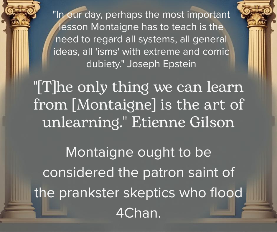 I’d even argue that Montaigne couldn’t have done much more than teach us to unlearn. If he’d started to do anything more constructive, he would’ve cut against everything he was (un-)teaching. In this, he may have been the modern age’s first superfluous man, beating Albert Jay Nock to the skeptic’s modest punch by 400 years.