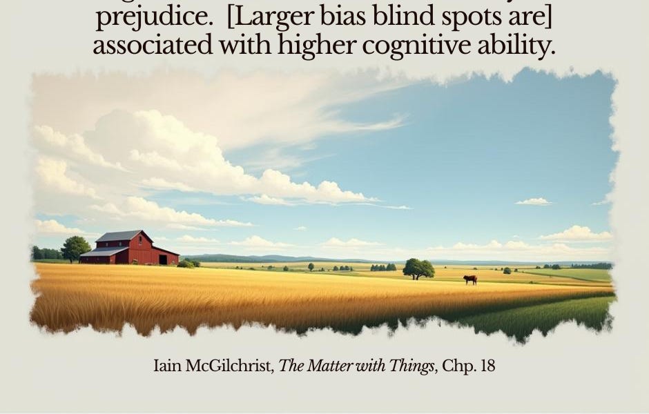 It's a riff off perhaps the best essay in the current issue of County Highway: "Everyone is in a Cult." Subtitle: Welcome to the schizophrenia factory, which is significant: siloed left hemispheres and schizophrenia exhibit some serious Venn. One of McGilchrist's favorite reference points is Louis Sass' Madness and Modernism, which looks at mental illness and modern art. I'm halfway through it, and it's been great, but at the same time, it's one of those books that seems to make its point compellingly in the first 75 pages. After that, it feel like a case of "piling on," so it's back on my shelf for now. I have hopes of finishing it later, but alas, many bookmarks in similar books in my library stare at me every morning.