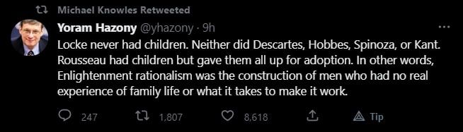 This is hugely important. In brief: Enlightenment rationalism is all about left hemisphere control over things it can't understand. The right hemisphere respects the things it can't understand, including things like "love" and the intuitive, implicit, poetic, tacit knowledge that comes from grappling with life in the trenches.