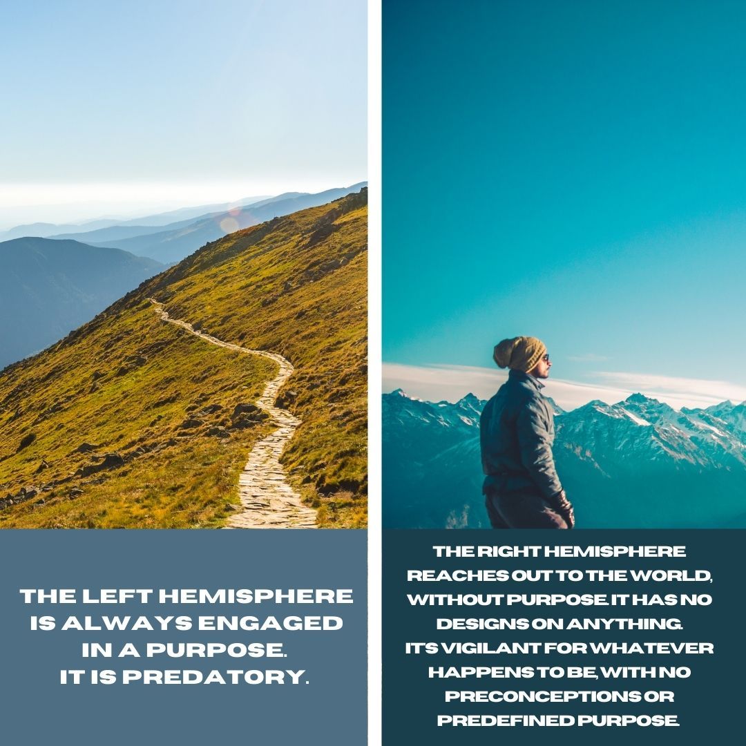 The more our left hemisphere controls our mental world, the more our mental world assumes a disposition that reflects how the left hemisphere attends to things.