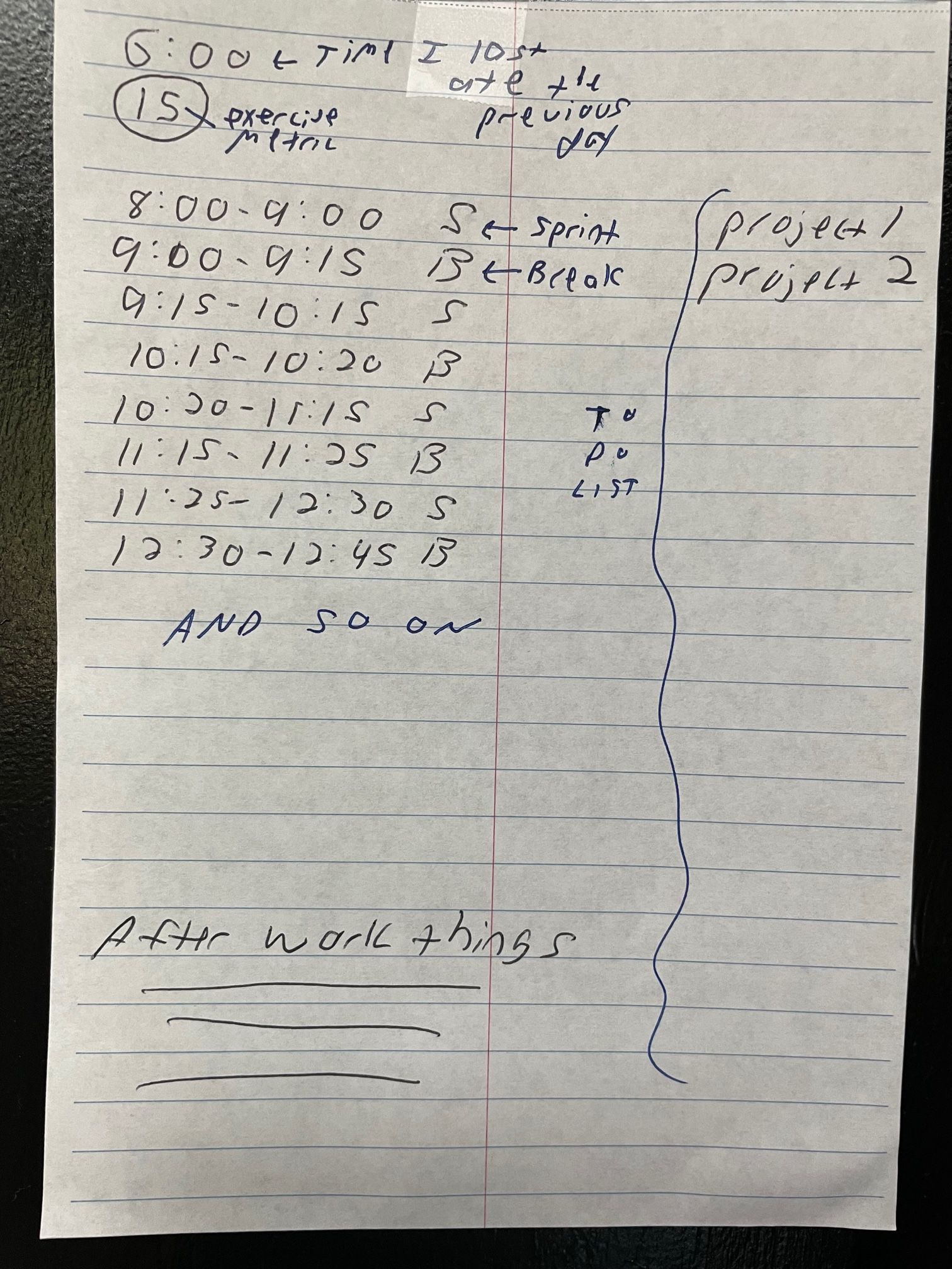 When I first get to the office, I slowly and calmly map out my day. Here's a typical notecard: